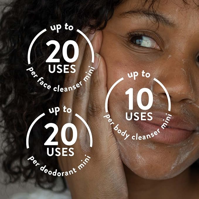 • Contains: Three unscented minis for skincare and body care. A pH balanced face cleanser, a soap-free cream body cleanser, and an aluminum-free deodorant, for fresh, clean skin.