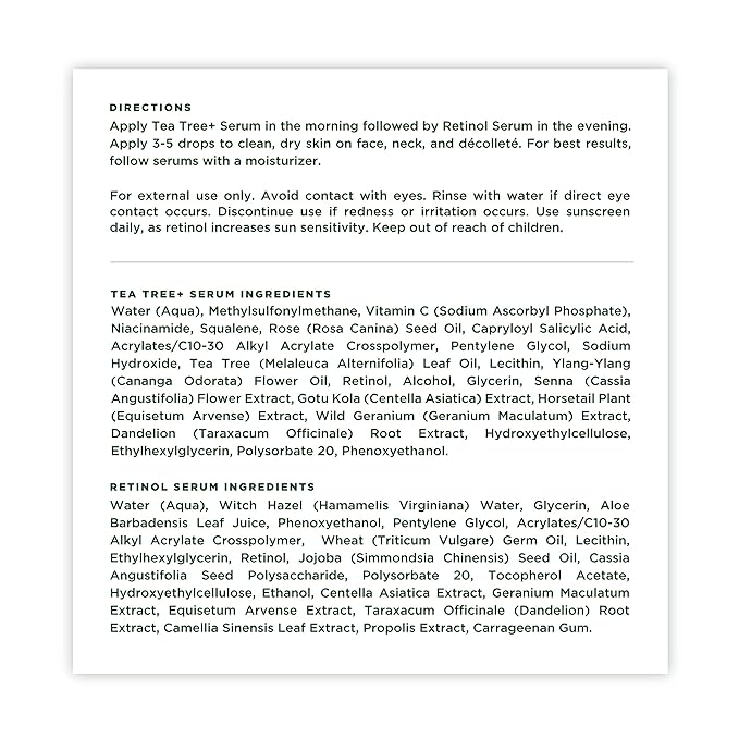 • Directions: Apply Tea Tree+ Serum in the morning followed by Retinol Serum in the evening. Apply 3-5 drops to clean, dry skin on face, neck, and décolleté. Use sunscreen daily, as retinol increases sun sensitivity. For best results, follow serums with a moisturizer.