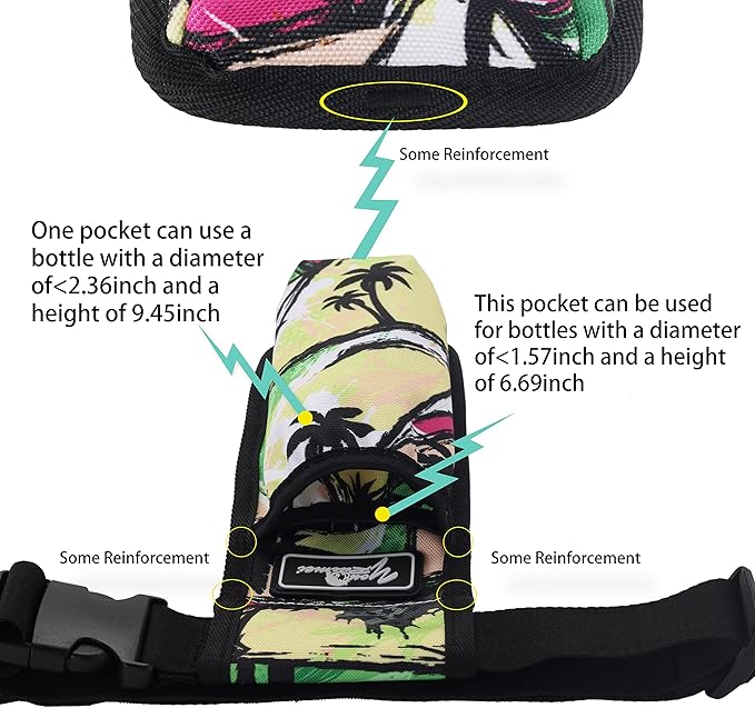 • 3、Design: * The design of the bag has a total of 3 pockets, the front design has two large pockets and two small pockets can be used for different capacity bottle, the large pocket can be used for the diameter ≤2.36inch 9.45inch bottle; In addition, the two small pockets can be used for bottles with diameter ≤1.57inch and height of 6.69inch;