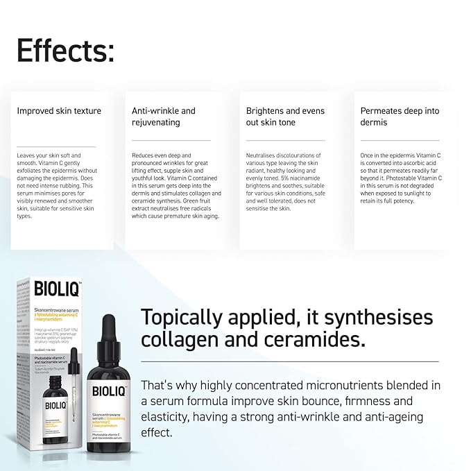 • Reduces even deep and pronounPowerful Facial Serum Fusion: Bioliq Pro Photostable face serum combines photostable vitamin C and niacinamide, offering versatile and broad-spectrum effects at an ideal pH for maximum bioactivity.ced wrinkles