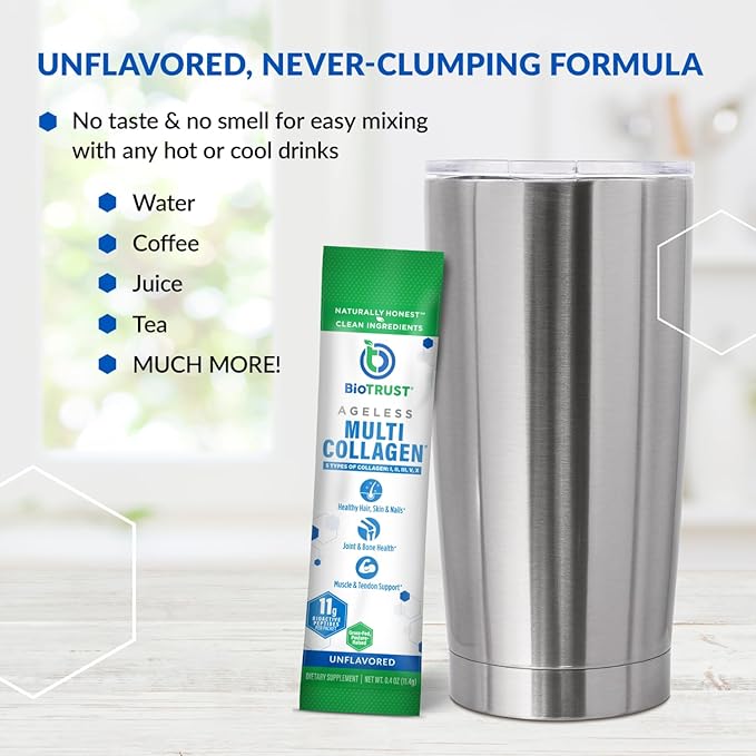 • MIXES EASILY WITH NO CLUMPS. Our unflavored Multi-Collagen dissolves quickly and easily in hot and cool liquids. Add a packet to your morning coffee, smoothies, or baking recipes.