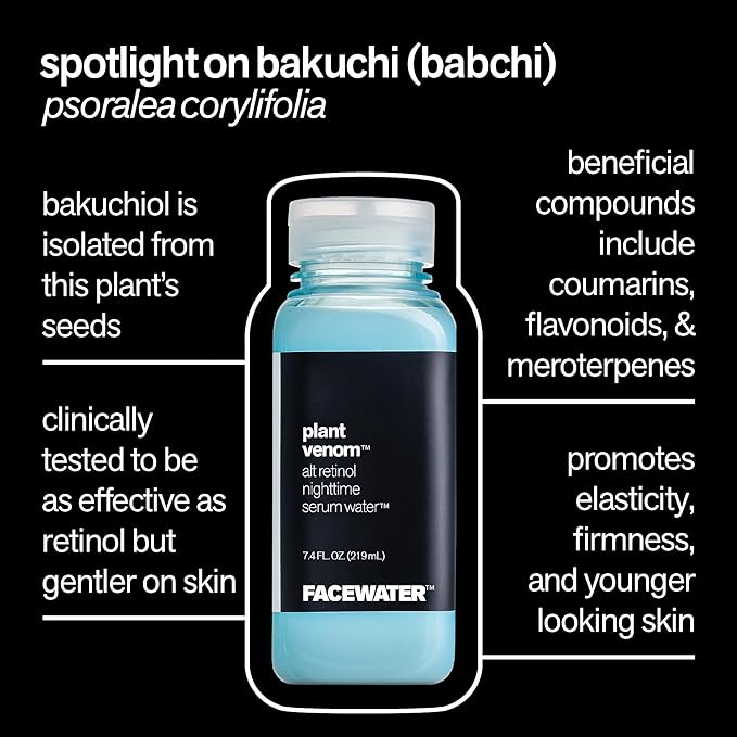 • A deeply penetrating, age-defying serum water made with bakuchiol, a plant derived retinol alternative and distilled bakuchi seed.