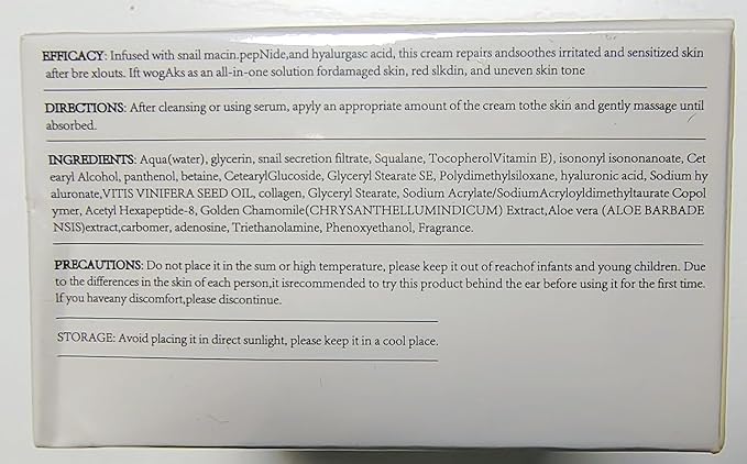 • 【DAILY FACIAL REPAIR】Use this cream daily to repair and nourish your skin, giving it a healthy and glowing complexion. It's easy to apply and quickly absorbs into your skin, leaving no greasy residue. Enjoy the benefits of snail mucin for your skin with It!
