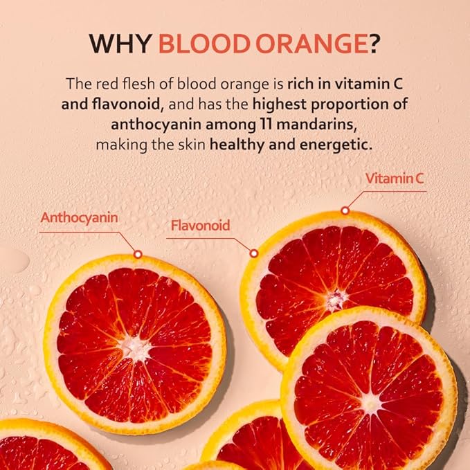 • WHY BLOOD ORANGE? The red flesh of blood orange is rich in vitamin C and flavonoid, and has the highest proportion of anthocyanin, making the skin healthy and adding radiance to dull skin
