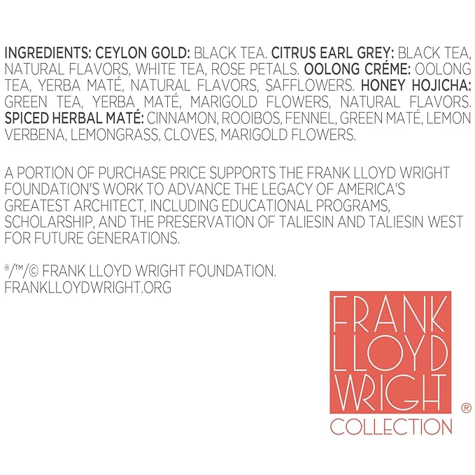 • GROUNDING TEAS make up this distinct colleciton and is expertly crafted to pay homage to the iconic architect. From robust classics to spiced warming blends, each tea evokes a connection to nature, beauty, and tradition.