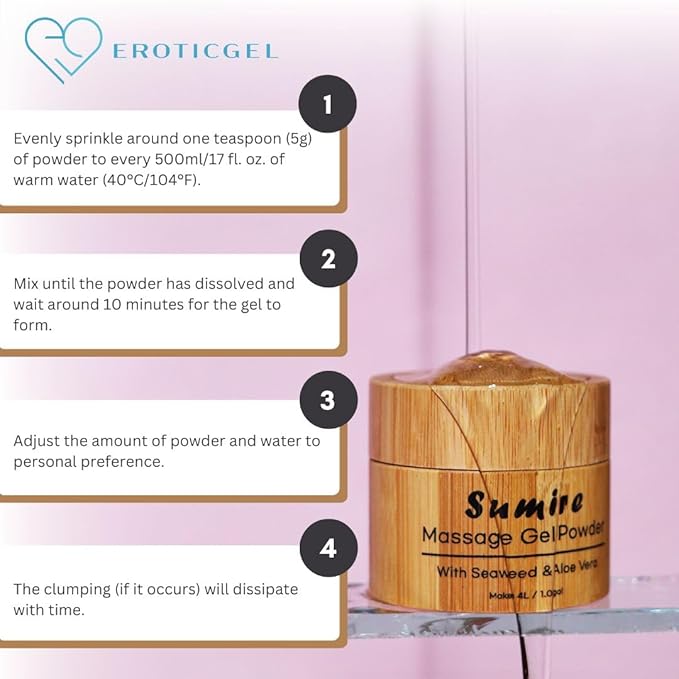 • Our Massage Gel Powder is made with natural ingredients like seaweed and aloe vera, offering a safe and nourishing massage experience. It’s free from parabens and glycerine for peace of mind.