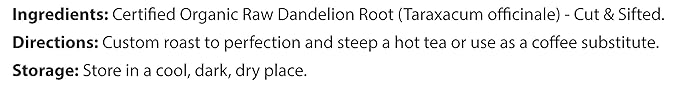• IMPORTED FROM Bulgaria - This bag contains certified organic, cut and sifted dandelion root from Bulgaria.