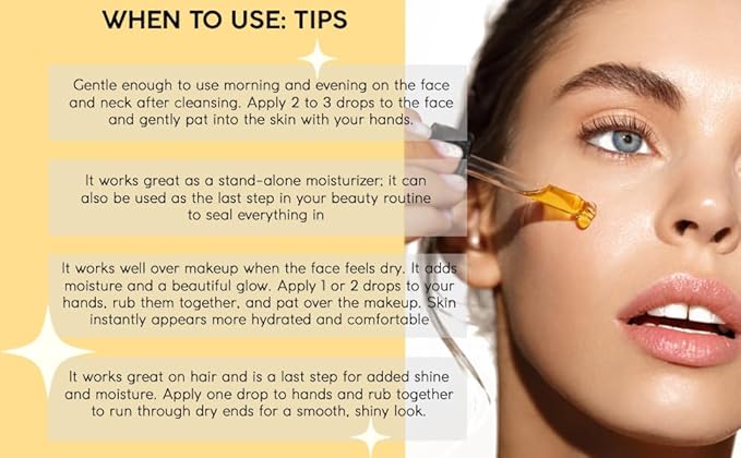 • It can also be used on the face, neck, body, nails, and hair. Superior moisturizers help balance skin. It comes in a glass dropper bottle. This oil is not greasy and completely sinks into the skin within a few minutes. It suits all skin types and is excellent for dehydrated and mature aging skin. It can be used at night or during the day under makeup.