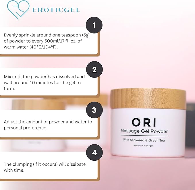 • Our Massage Gel Powder is made with natural ingredients like seaweed & green tea, offering a safe and nourishing massage experience. It’s free from parabens and glycerine for peace of mind.