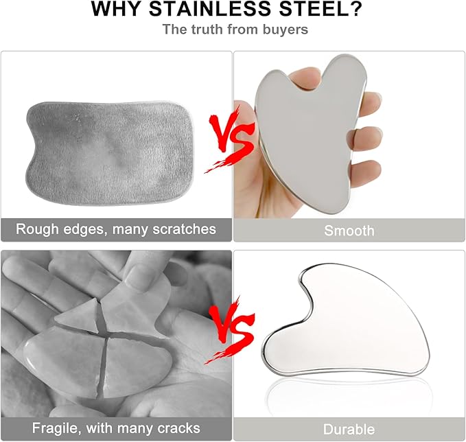 • 【Gua Sha Tool for Face】The Gua Sha massage tool and facial roller is made of high-quality stainless steel, polished to the mirror-like surface, massage tools are durable, smooth and easy to clean and provide sensitive support for massage.