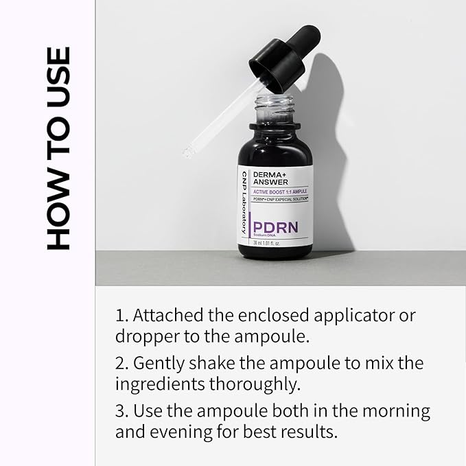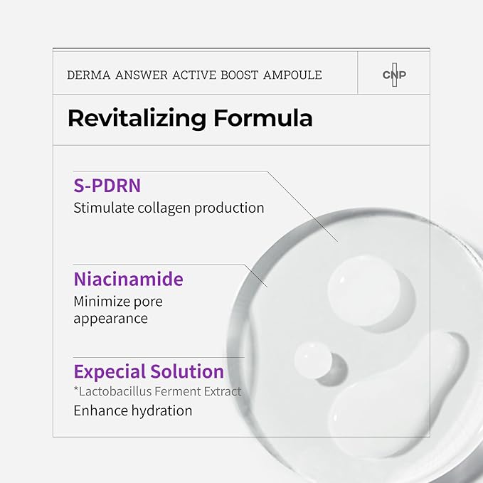 • CNP DERMA ANSWER ACTIVE BOOST AMPULE (30ml/1.01fl oz) - CNP Derma Answer Active Boost Ampule rejuvenates skin by targeting aging signs, enhancing elasticity, and diminishing the appearance of fine lines, revealing a youthful appearance in just 4 weeks.