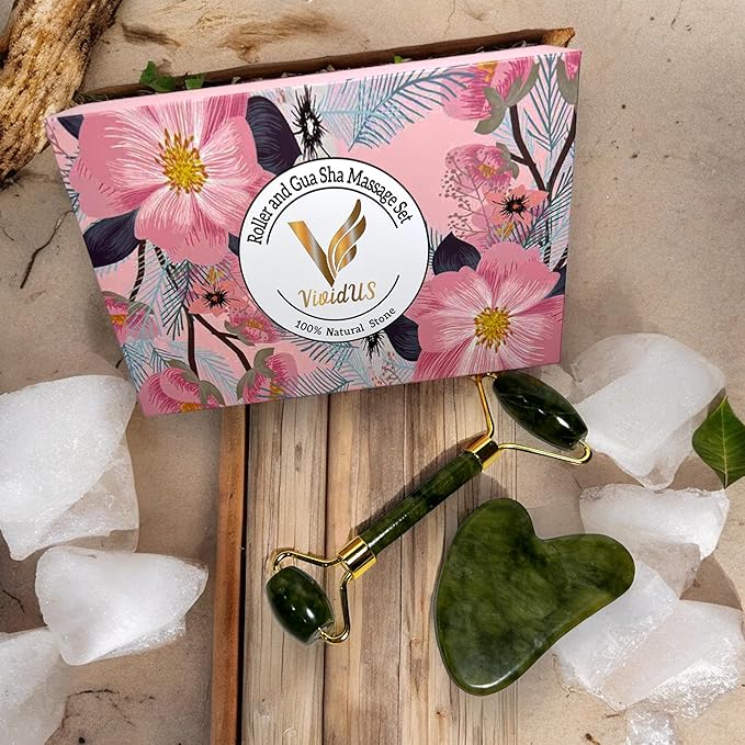 VIVIDUS Gua Sha and Jade Roller Set for Facial Massage, Improve Wrinkles, Reduce Puffiness and Redness, Gua Sha Stone Self Care Gift Set for Women Men (Green)