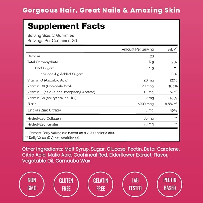 • Tasty Berry Delight: Experience vitamins that are delicious too! Enjoy the vibrant berry flavor while giving your hair, skin, and nails the nourishment they deserve.