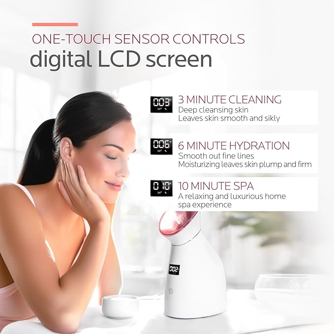 • Professional Facial Care: Upgrade face humidifier with LCD screen timer and smart touch switch. The face steamer for facial takes only 10 seconds to release a fine mist of nano ionic steam, gently cleansing deep within your pores and opening up your skin's absorption channels. Enjoy a comfortable at-home spa experience with a soothing steam temperature of 104℉ and an 15-minute runtime.