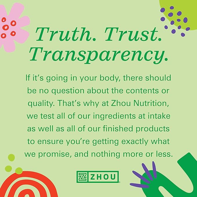 • Based in the Heart of Utah – At Zhou, we use only the highest-quality ingredients in a facility following GMP (good manufacturing practices). Plus, we test everything at our lab in Utah, so you can be confident that you're fueling your body with the very best.