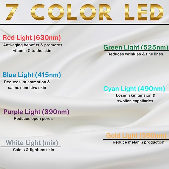 • (7-IN-1 FACIAL TOOL) This 7-in-1 face device has 7 different LED light modes that have numerous skin care functions, which can provide a total of 7 individual benefits for skin.