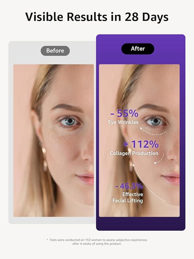 • Clinically Proven Benefits: Experience remarkable transformations, including a 452.3% increase in collagen production, a 39.7% reduction in sagging skin, a 32.8% decrease in wrinkles, a 47.6% improvement in skin smoothness, and enhanced firmness and elasticity after just a 3-week session. Results are based on clinical studies; individual outcomes may vary