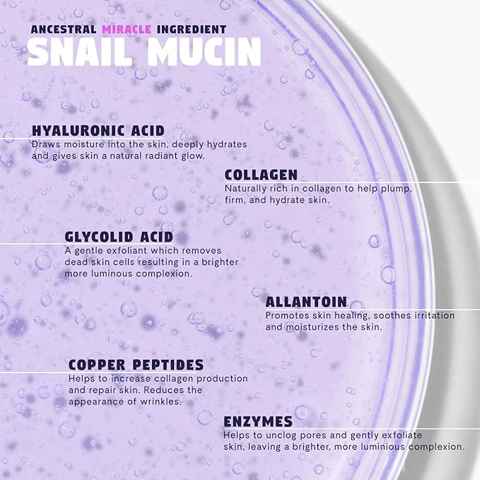 • Special Ingredients : Hyaluronic Acid, Glycolic Acid, Collagen, Ectoin, 97% Snail Secretion Filtrate