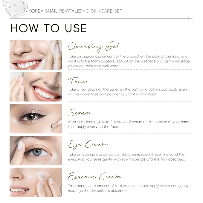 • [KOREAN SNAIL SKINCARE SET 5-PACK] - Korean snail skin care kit has all your favorite moisturizing necessities: including 50g cleanser, 100ml toner, 17ml face serum, 25g face cream and 15g eye cream and leaving your skin soft and vibrant since the first skincare.