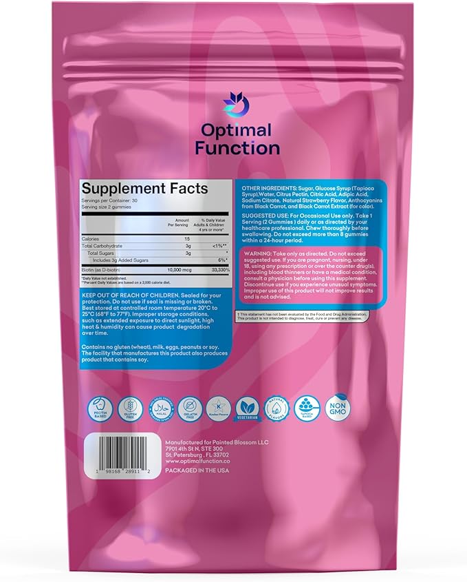 • Optimal Function's Biotin Hair Skin and Nails gummies offer a convenient and delicious solution for individuals seeking beauty and wellness support. With their great taste and easy-to-consume format, these gummies are perfect for those with busy lifestyles. Their portability makes them a go-to choice for on-the-go nourishment, and being gluten-free and Non-GMO, they cater to a wide range of dietary needs, ensuring everyone can enjoy their benefits hassle-free.