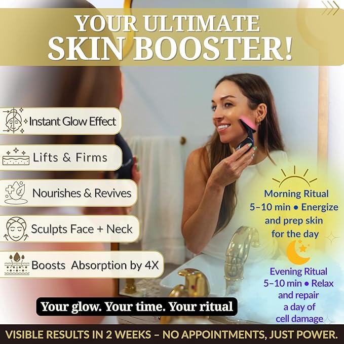 • 3-in-1 Glow Technology Our triple-action device uses light, vibration, and heat to support a more sculpted, lifted look—especially along the jawline, cheeks, and neck. Great for enhancing your skin’s natural contour.