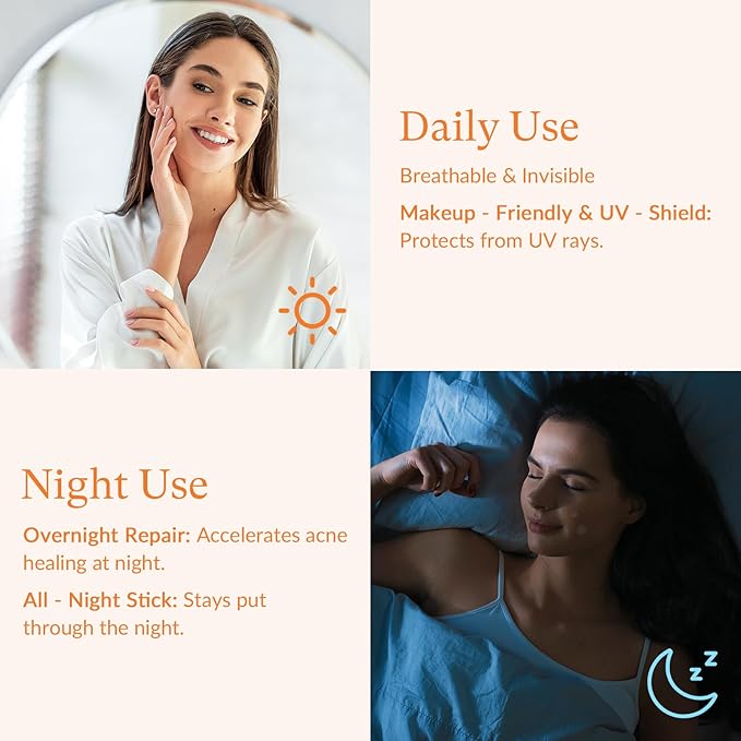 • Invisible Cover: These super-thin, clear pimple patches blend effortlessly with your skin, offering all-day comfort. They prevent picking and reduce the risk of infection, keeping your skin smooth and blemish-free. Ideal for use under makeup, they stay discreet whether worn during the day or overnight