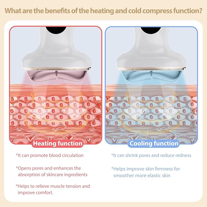 • Innovative Design - Unlike ordinary face and neck massage tools on the market, we have added a cold compress to the original heating function. The heating function can promote blood circulation, open pores, enhance the absorption of skin care ingredients, help relieve muscle tension and improve comfort. The cooling function can shrink pores, reduce redness and swelling, help improve skin firmness, and make the skin smoother and more elastic.