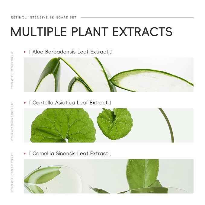 • 【Skincare Gift Set】This 5 PCS traval skincare set routine contains our Retinol Serum, Moisturizer, Eye Cream, Cleanser, Toner,. Our skin care sets for women contains a variety of plant essences, which can effectively repair damaged skin, smooth wrinkles and fine lines, shrink pores, and make skin moisturizing.