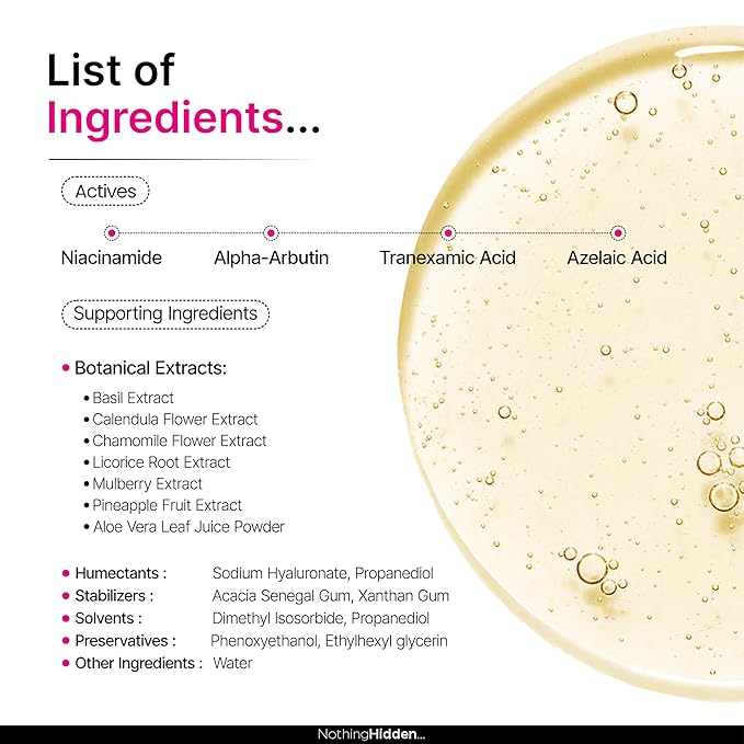 • CLARIFYING & EVEN SKIN TONE: Azelaic Acid helps with clogged pores, uneven texture, and inflammation, making it useful for acne-prone skin. Tranexamic Acid addresses dark spots, redness, and uneven skin tone by regulating melanin production. Alpha Arbutin reduces hyperpigmentation and helps lighten dark spots for a more even complexion.