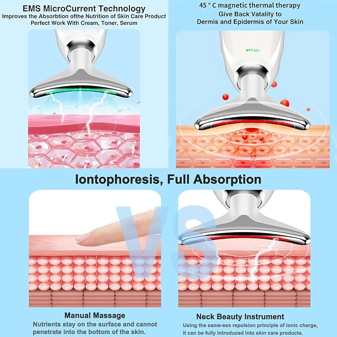 • 3 Powerful Modes and Ergonomic Design: Face and Neck Massager has 3 Massage modes that vibrate and equalize heat. Adjustable mode to meet your various needs. The gentle massaging action also aids in the absorption of skincare products, allowing them to penetrate deeper into the skin for better efficacy. Streamline design fit for ergonomic theory, face or neck