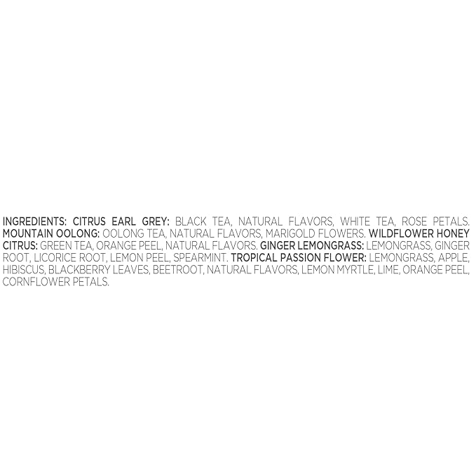 • TEA BLENDS - In this collection are crafted to evoke a sense of tropical tranquility and include: Citrus Earl Grey (Black tea), Mountain Oolong (Oolong Tea), Wildflower Honey Citrus (Green tea), Ginger Lemongrass (Herbal tea), and Tropical Passion Flower (Herbal Tea).