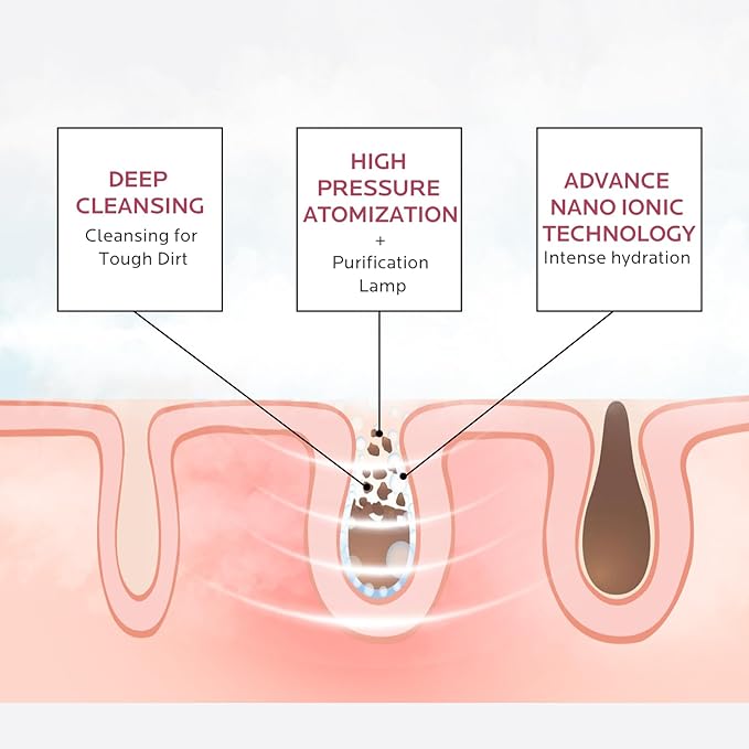 • Nano Ionic Steam for Deep Pore Cleansing: The upgraded face steamer uses nano-ionic technology to produce ultra-fine steam that penetrates deep into the skin, loosening dirt, oil, and blackheads. Pair it with the silicone cleansing brush to gently exfoliate, remove buildup, and reveal a cleaner, smoother complexion