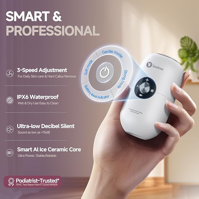 • 【3-Speed Grinding System】 Our electric foot callus remover features an industry-first 3-speed system (1200/1400/1650 RPM) for 3x faster callus removal. The 1650 RPM mode erases 3mm-thick calluses in 10 seconds—ideal for electric foot file users seeking salon-level results during a quick bath.