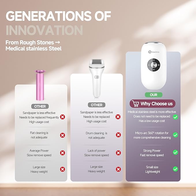 • 【Durable 316F Stainless Steel Heads】 Upgrade from manual foot sanders for feet! This electric callus remover uses lifetime 316F steel heads (no replacements needed) to save $60/year and prevent bacterial growth—perfect for hygienic electric foot filer routines.