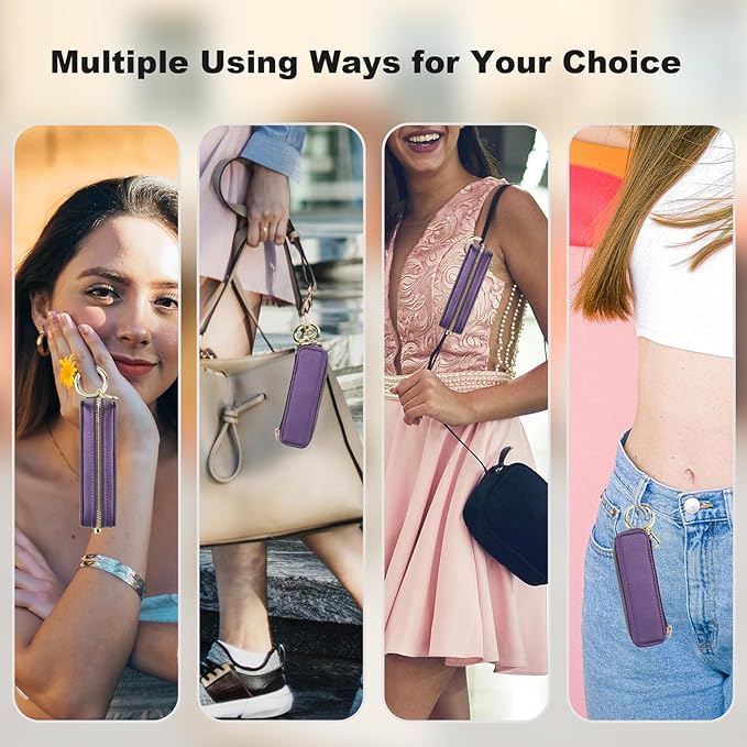 Bocasal Leather Lipstick Case Holder Chapstick Keychain Pouch, Zipper Lip Balm Lip Gloss Bag for Purse with Elastic Band, Makeup Travel Organizer, Cosmetic Storage Kit for Women Girls (Dark Purple)