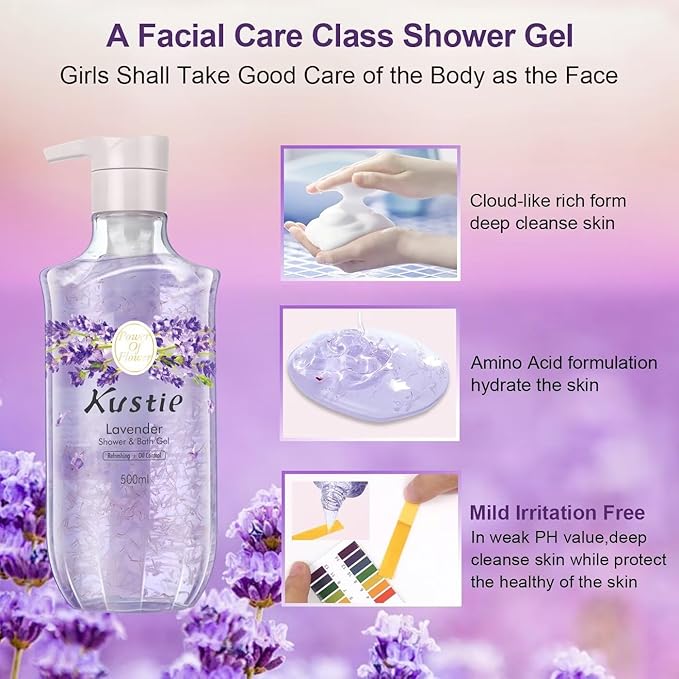• Long-lasting Fragrance Body Wash for Women: Experience a 24-hour long-lasting, refreshing lavender fragrance that uplifts your senses.(Top Notes: Lemon, Apple, Peach, Green Notes,Middle Notes: Lavender, Magnolia, Lily of the Valley, Rose,Base Notes: Sandalwood, Amber, White Musk)
