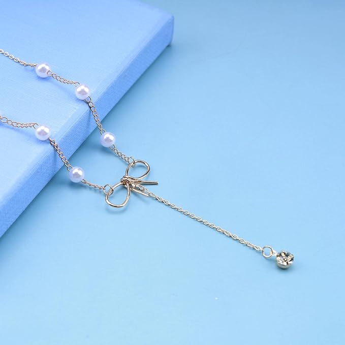 • Bow knot Y necklace chain made of high quality alloy and imitation pearl,make the surface of the necklace brighter,hypoallergenic,won’t irritate your skin.