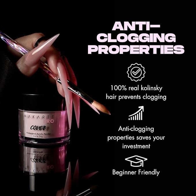 • Anti-Clogging Properties: Our professional acrylic brushes are made with pure kolinsky hair, which is necessary for keeping your nail brushes unclogged with acrylic.