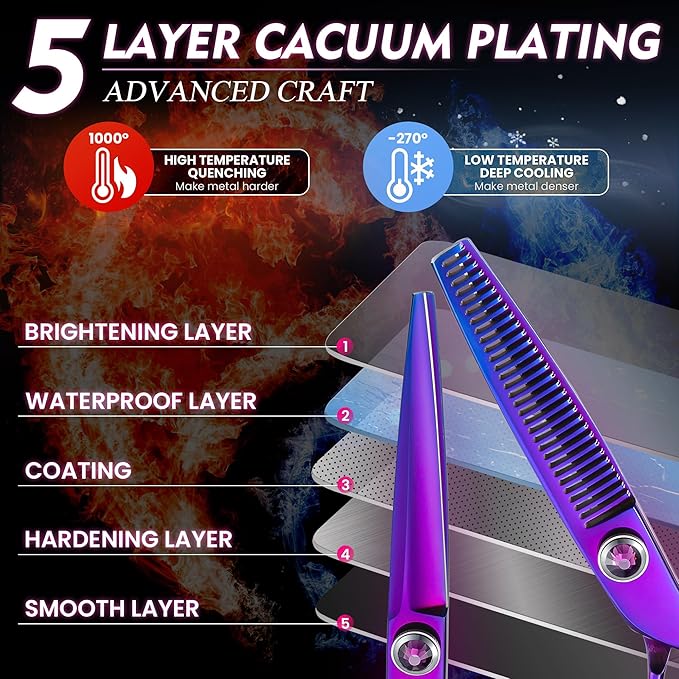 • ULTRA SHARP & DURABLE - The hair cutting shears set are made of premium Japanese 440C stainless steel. The super sharp blades with Convex edge, Hollow-ground are handmade by experienced craftsmen to ensure high sharpness and superior durability. The professional hair thinning shear is with 30 teeth and gives 20-25% thinning rate, it can thinning hair effortlessly without leaving marks or damaging hair.