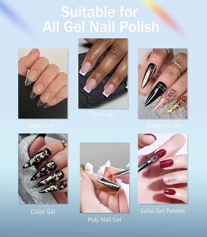 • Attention: Different types of gel may need different curing times due to differences in composition ratios. It is normal that the base coat remains sticky after using the led nail lamp.