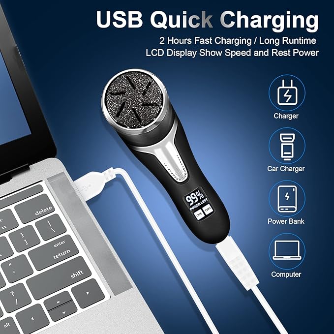 • Rechargeable Electric Foot Callus Remover, LCD Display ----- Foot file callus remover for feet only need 2hours usb charging and could get a 120min long runtime, including usb charging cable, this foot scrubber dead skin remover can easy charging with a laptop, power band, socket, and others; LCD Display show the speed and power status, let you how much battery left and remind you charge in time