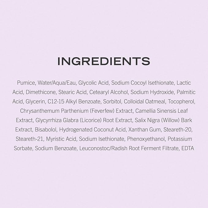 • Buff Away Dead Skin: Glycolic and Lactic Acids at a combined level of 10% help loosen skin’s top layer and decongest pores, while Pumice Buffing Beads (NOT microplastic!) whisk it all away