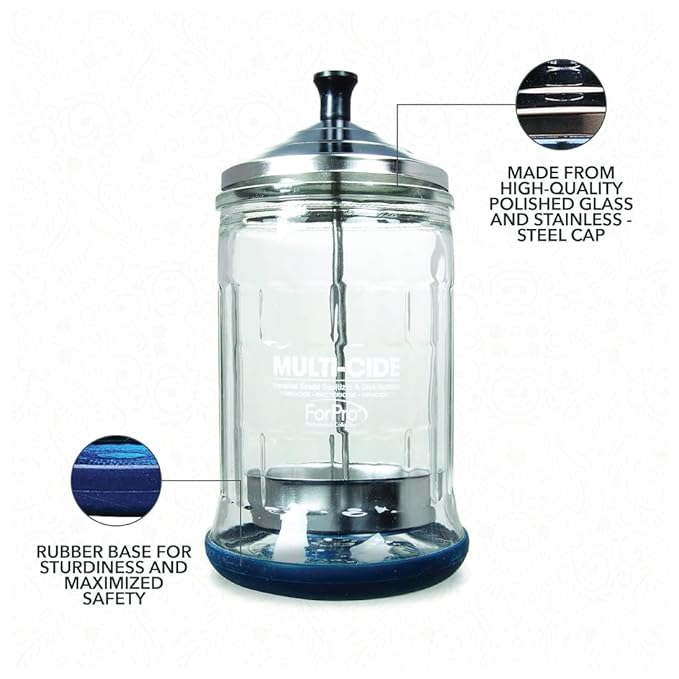 • Disinfecting Jar: Easy-grip handle of the jar permits immersion and removal of implements. Also features a rubber base for better sturdiness and maximized safety.