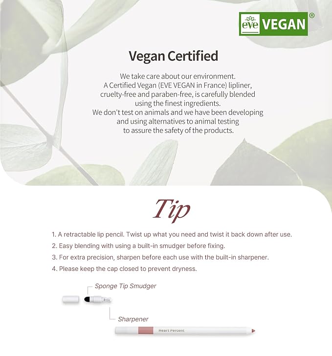 • [Vegan Certified] We take care about our environment. A Certified Vegan (EVE VEGAN in France) lipliner, cruelty-free and paraben-free, is carefully blended using the finest ingredients. We don't test on animals and we have been developing and using alternatives to animal testing to assure the safety of the products.
