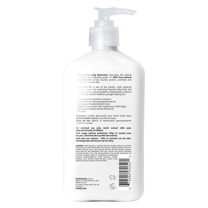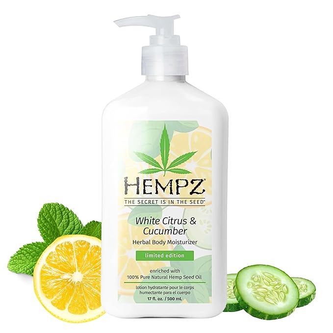 • Hydrate skin with the 100% pure hemp seed oil in our NEW White Citrus & Cucumber and leave it with a crisp, invigoring scent. 17 ounces in a pump bottle. Hempz vegan lotion moisturizes and hydrates skin with 100% hemp seed oil and other natural extracts. 17 ounces in a pump bottle.