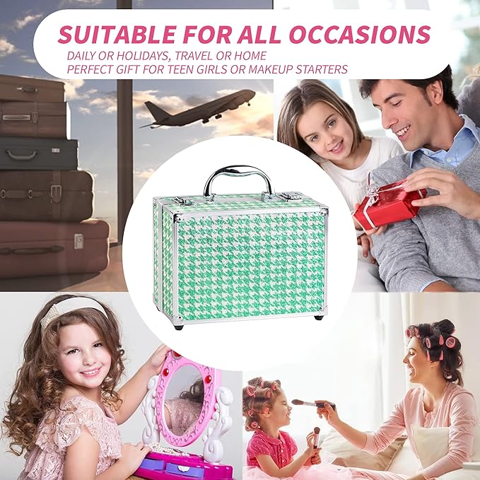 • Chic Sturdy Aluminum Organizer: The makeup train case, which is durable and spacious, comes in cute green houndstooth pattern surface and is made with reinforced aluminum frames for extra durability and protective. Portable Size: 9.84 x 6.7 x 3.54 inches