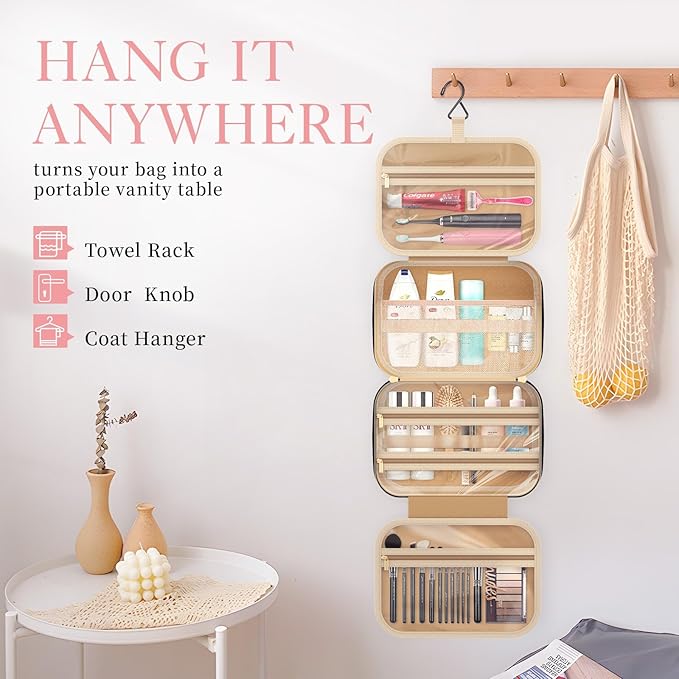 • STURDY HOOK DESIGN: Featuring a premium metal hook, the HOTOR cosmetic travel bag offers the convenience of hanging from a towel rack, coat hook, or any available space. This not only showcases your toiletries and cosmetics for easy accessibility but also saves valuable bathroom counter space. The sturdy metal hook is designed with a retractable feature, allowing it to be neatly stowed away when not in use.
