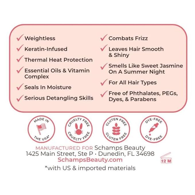 • Product Benefits : Weightless, keratin-infused, convenient leave-in conditioner that smells like sweet jasmine and leaves hair smooth, shiny, and detangled Weightless, keratin-infused, convenient leave-in conditioner that smells like sweet jasmine and leaves hair smooth, shiny, and detangled