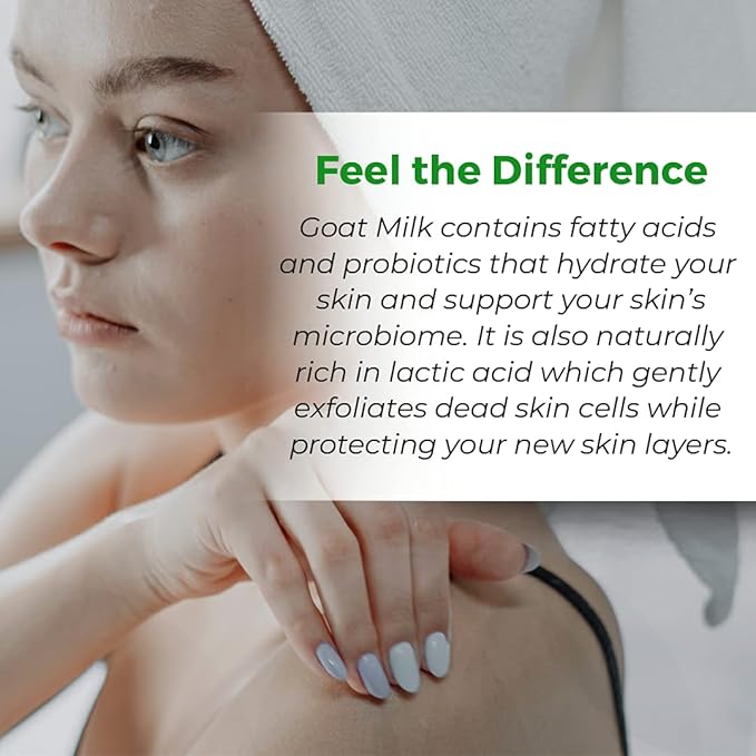• THE SKIN BENEFITS OF GOAT MILK : Goat milk works wonders for your skin. Enriched with fatty acids and probiotics, it nourishes and hydrates, fostering a healthy skin microbiome. Additionally, its natural abundance of lactic acid gently sloughs away dead skin cells, safeguarding and promoting the emergence of fresh, revitalized skin layers.