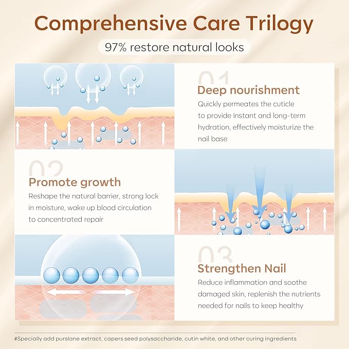 • 【Pure Organic Ingredients】The key ingredients are Glycerin, Jojoba oil, Macadamia Ternifolia seed oil and Vitamin E. These natural oils are excellent for moisturizing and relief cuticle to reduce dry cuticles, hangnails. Portulaca Oleracea Extract is specially added to this nail repair cream, which gives super power to cuticle growth, making nails and cuticles stronger. It is our must-have daily nail care products.